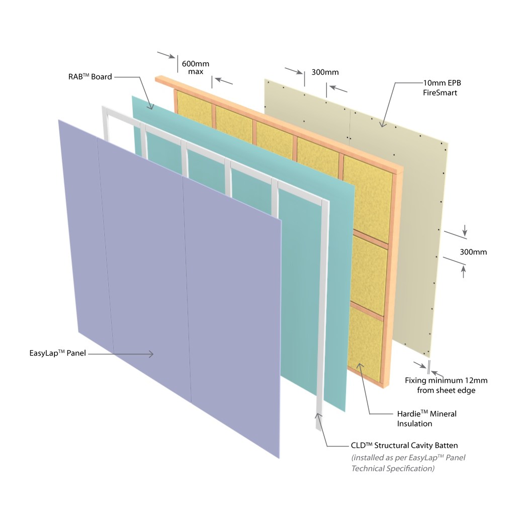 1 x 10mm EPB FireSmart on Internal side James Hardie EasyLap™ Panel and RAB™ Board with CLD™ Structural Cavity Batten to External side
